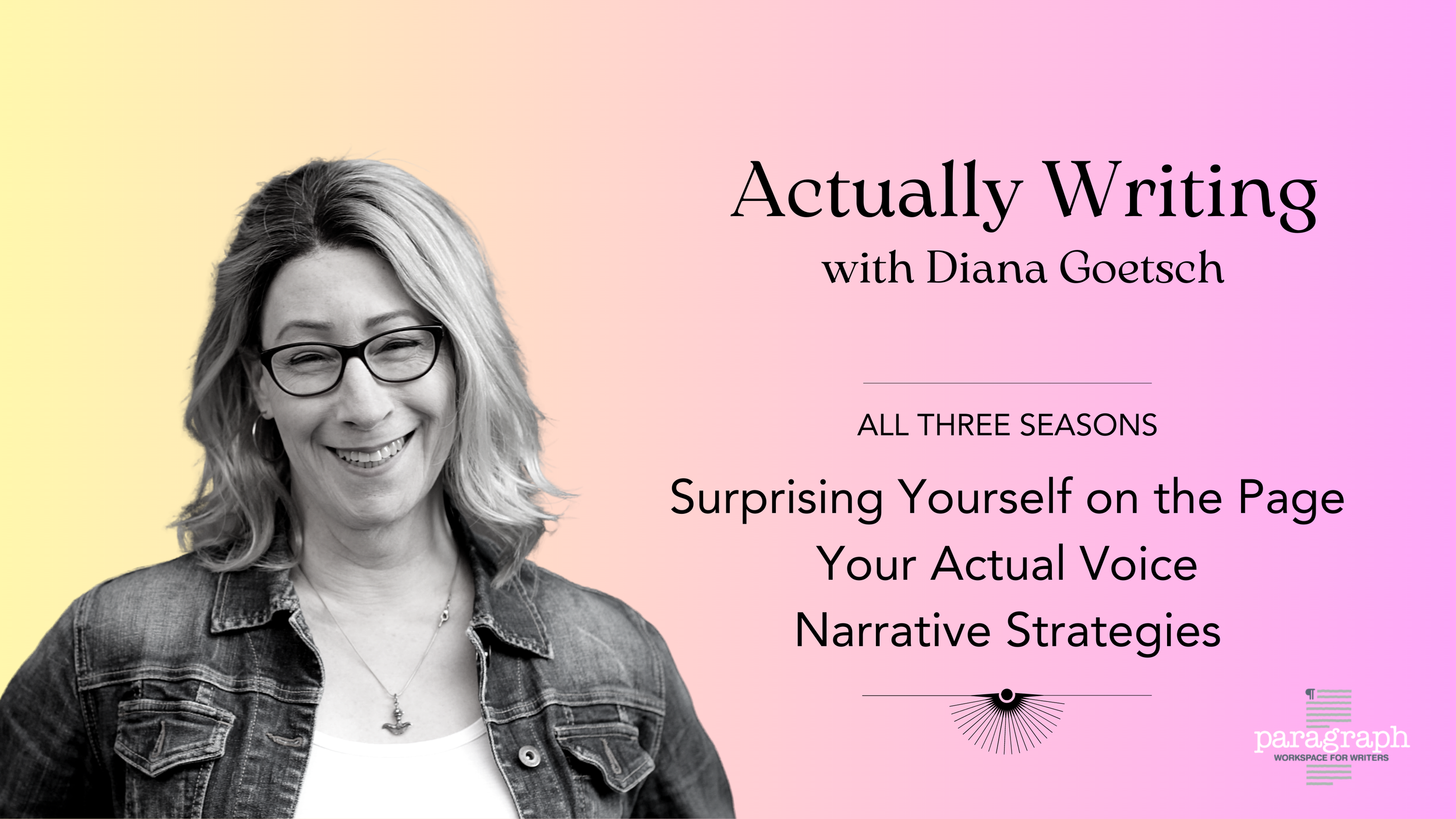 Each 10-week season works as a stand-alone class. The focus of Season One is Surprising Yourself on the Page; Season Two: Your Actual Voice; Season Three: Narrative Strategies.
